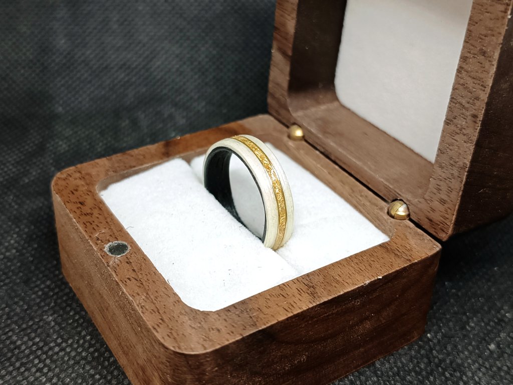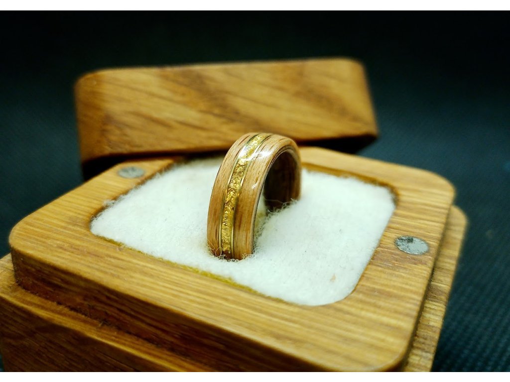 Just Gold je prsten, který vypráví příběh zlaté alchymie. Černočerný eben jako noc sama, přes něj naopak tměř bílá bříza jako zářivý sníh... Nebo tmavé ořechové dřevo vnitř prstenu v sobě skrývá tajemství prastarých lesů, zatímco dub vně ho obklopuje jako ochranný plášť. Přes vrchní dřevo 24karátové zlaté lístky a mosazné lemy rozlévají svou záři. Je to jako kousek ztraceného pokladu, který čekal na svého objevitele v hlubinách přírody.